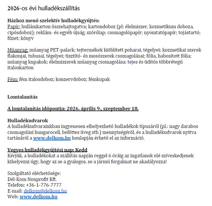 Lakossági tájékoztató szelektív hulladék december havi szállítási időpontjáról